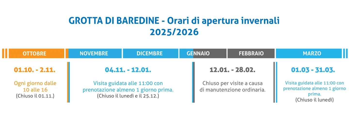 - Per motivi organizzativi, i biglietti online per la Grotta di Baredine possono essere acquistati al massimo un giorno prima della visita.